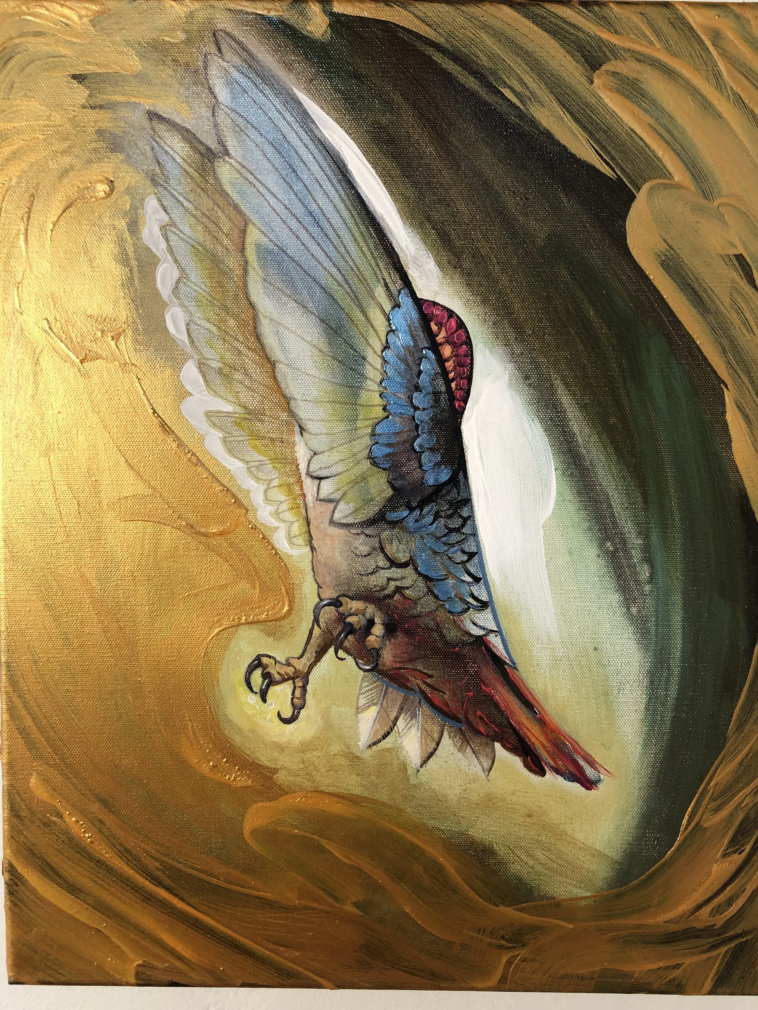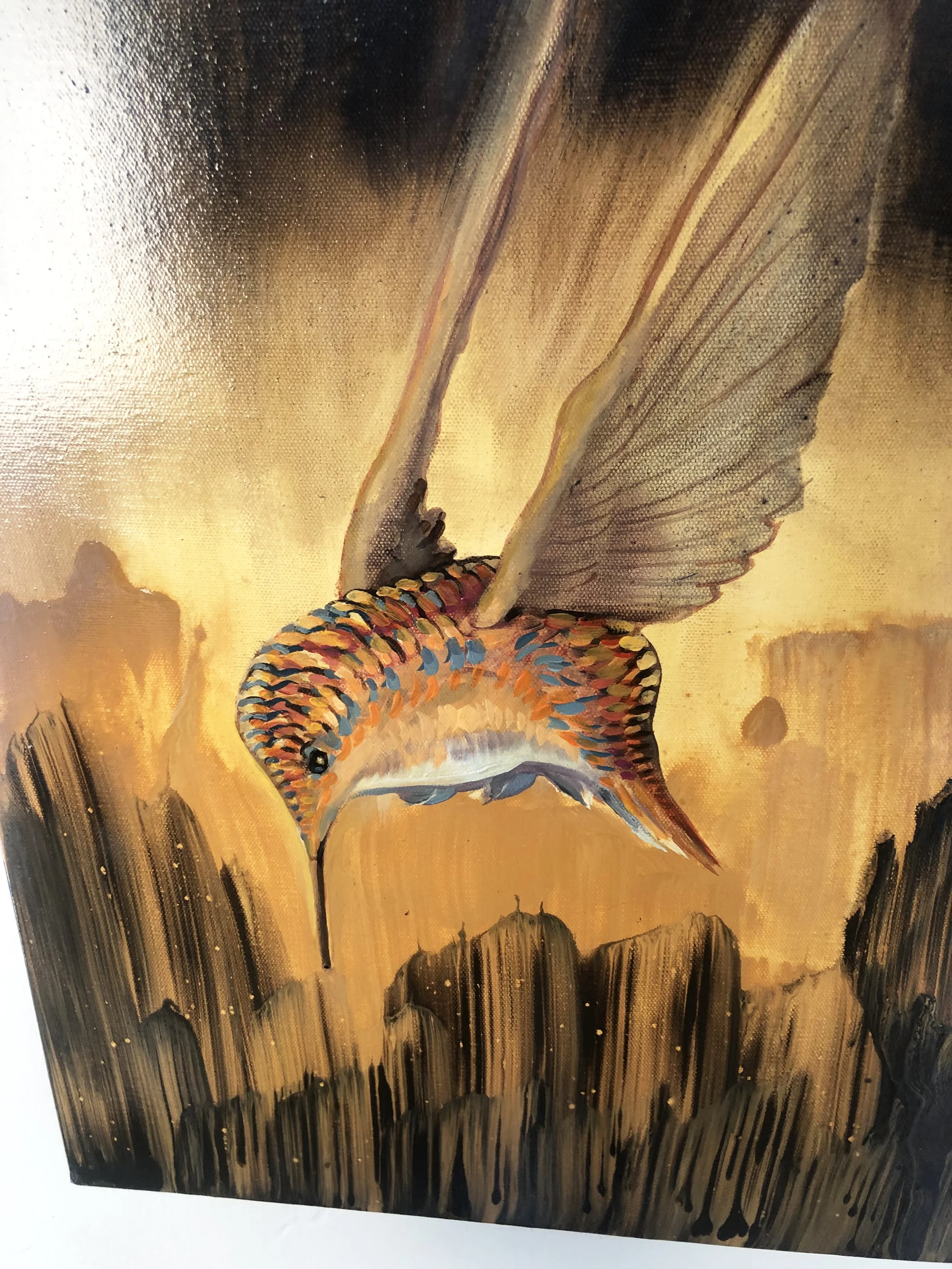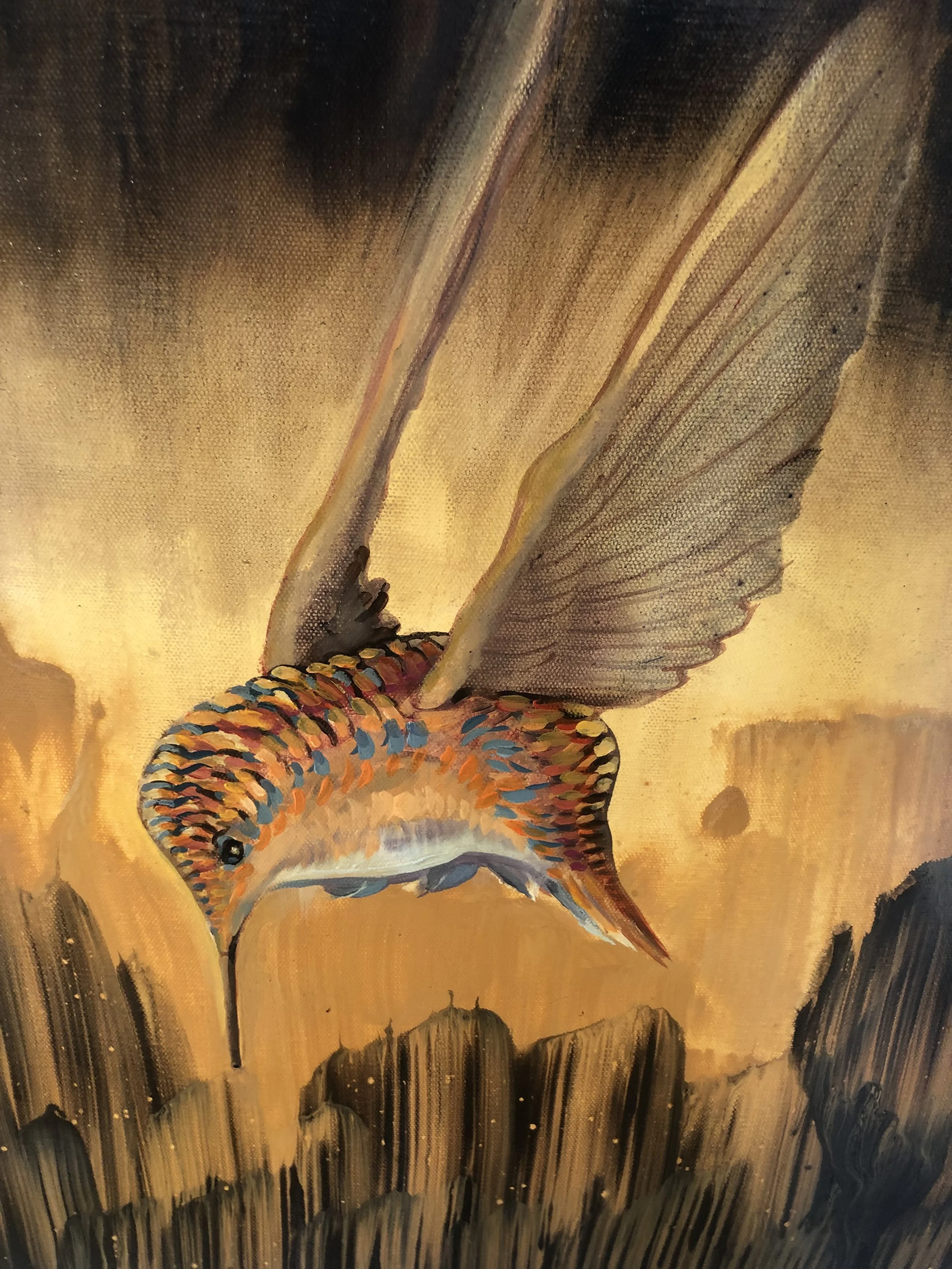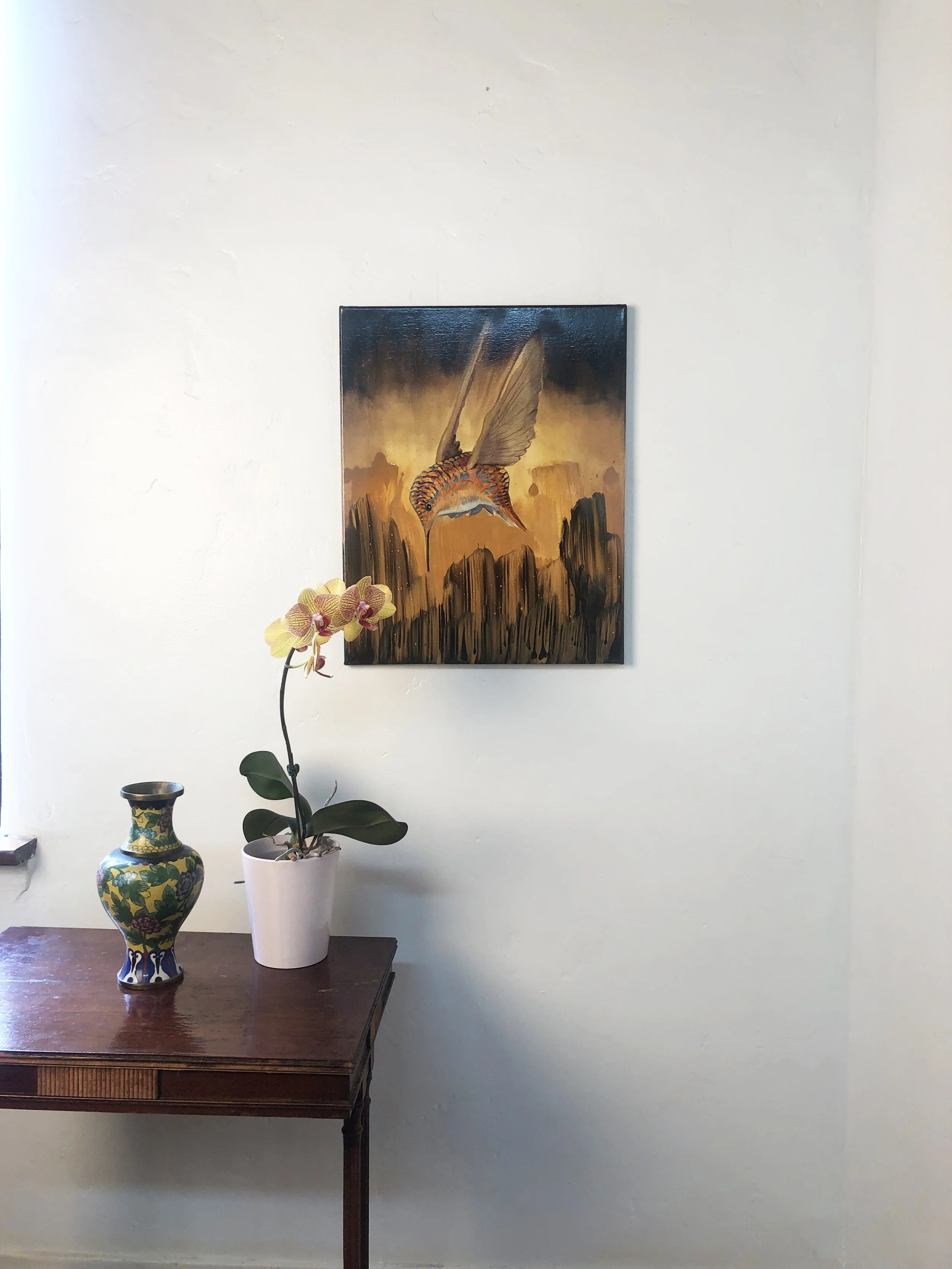 “These ocean paintings are a visceral response on my part, to point out that the oceans, and the creatures in it, are both alien to us, and at the same time our brothers and sisters, evolved from the same chain of evolution.  Go diving , and look in the eyes of a harbor seal, or feel the baby octopus clinging to you for protection; these are strikingly beautiful things with souls, communicating with us.”