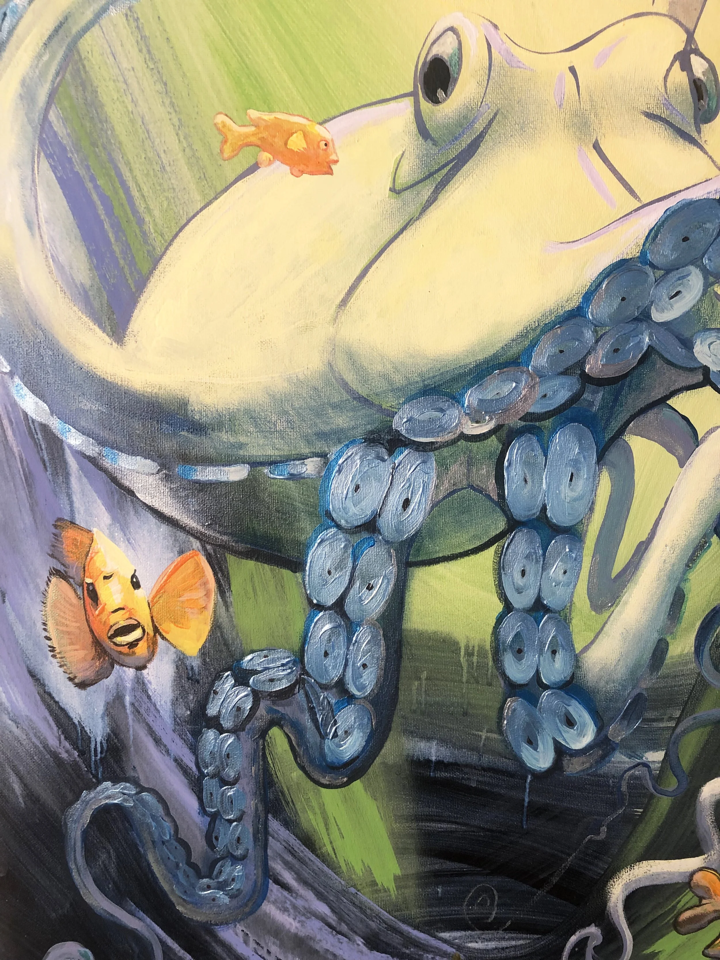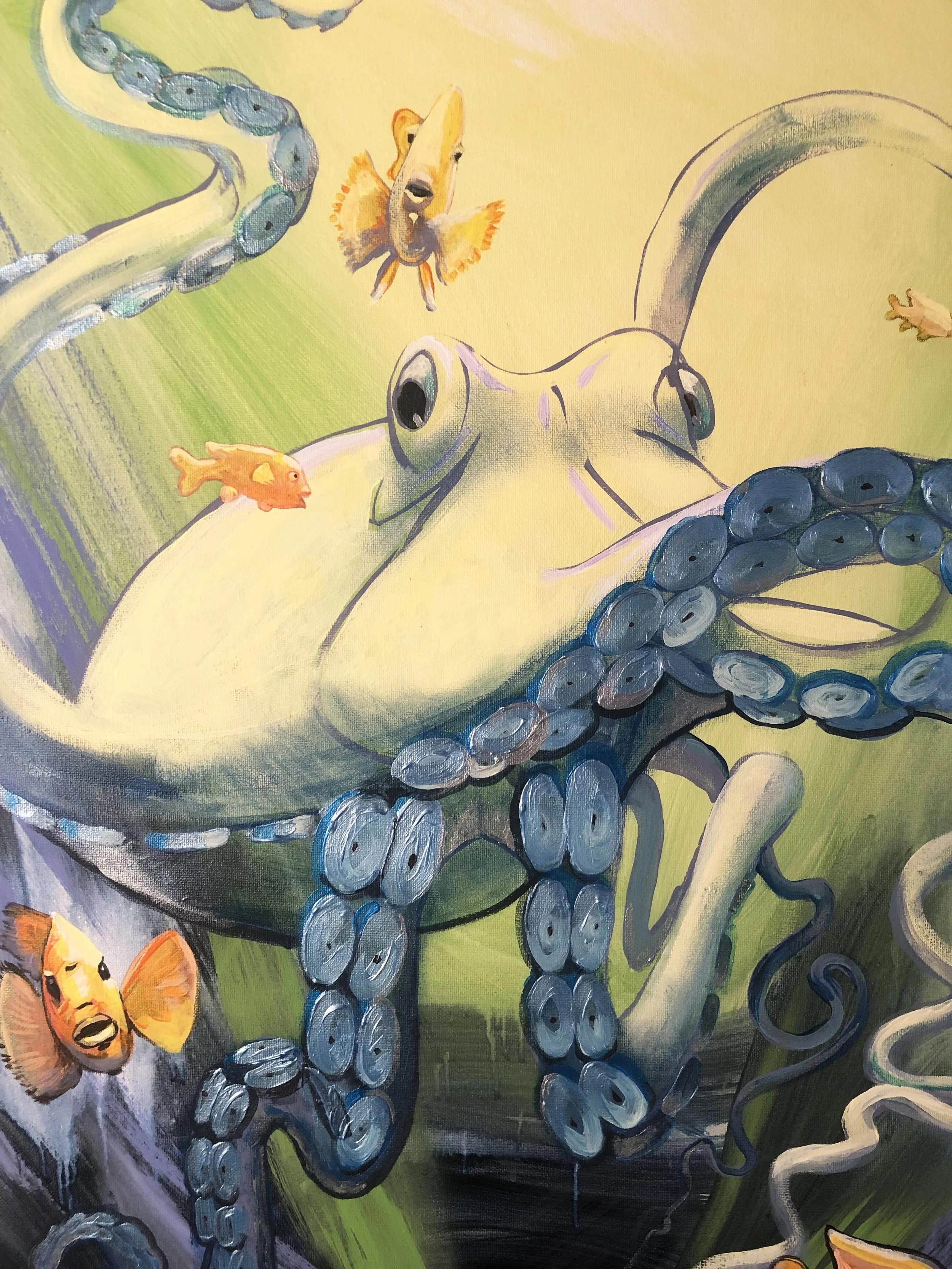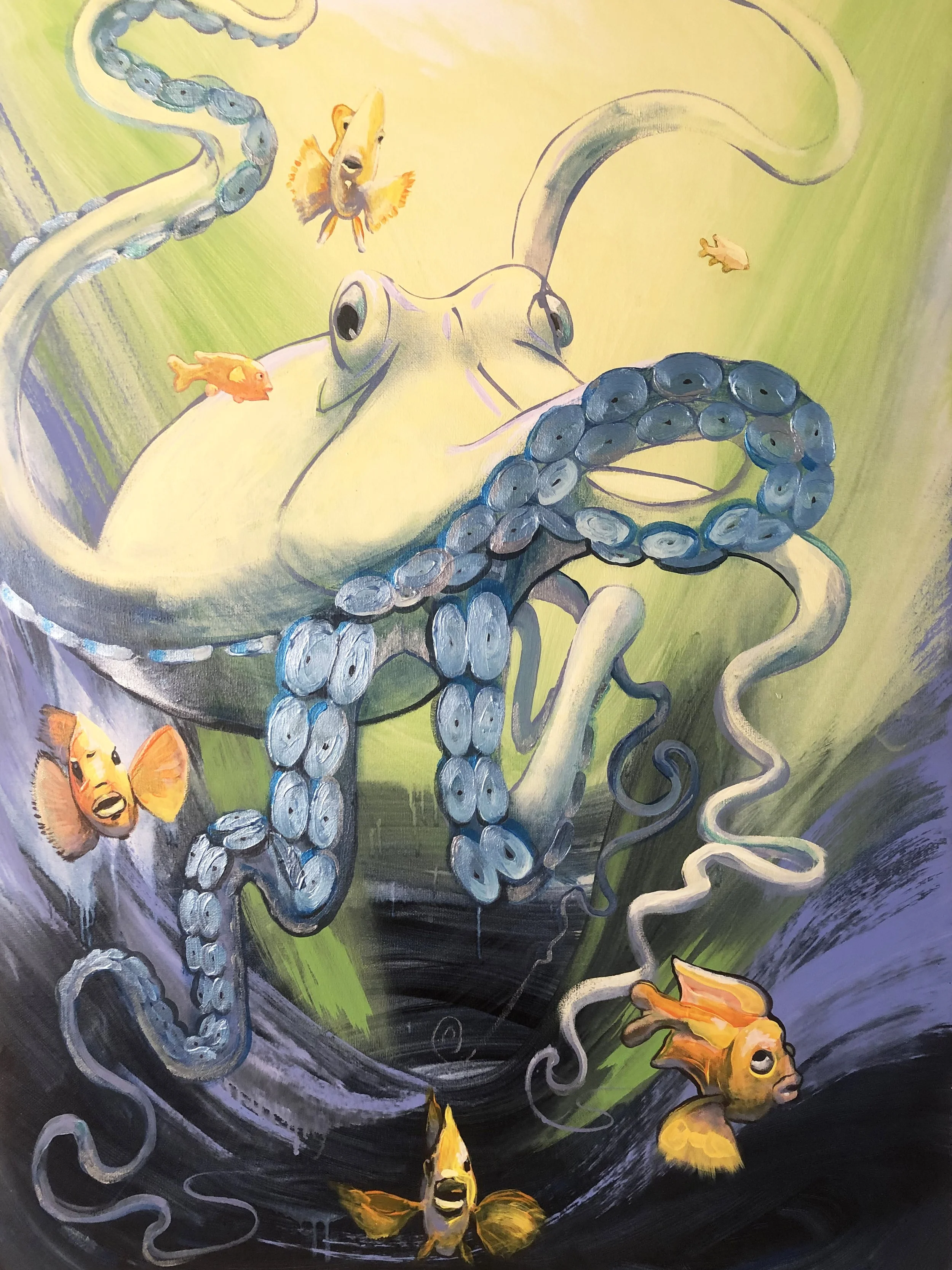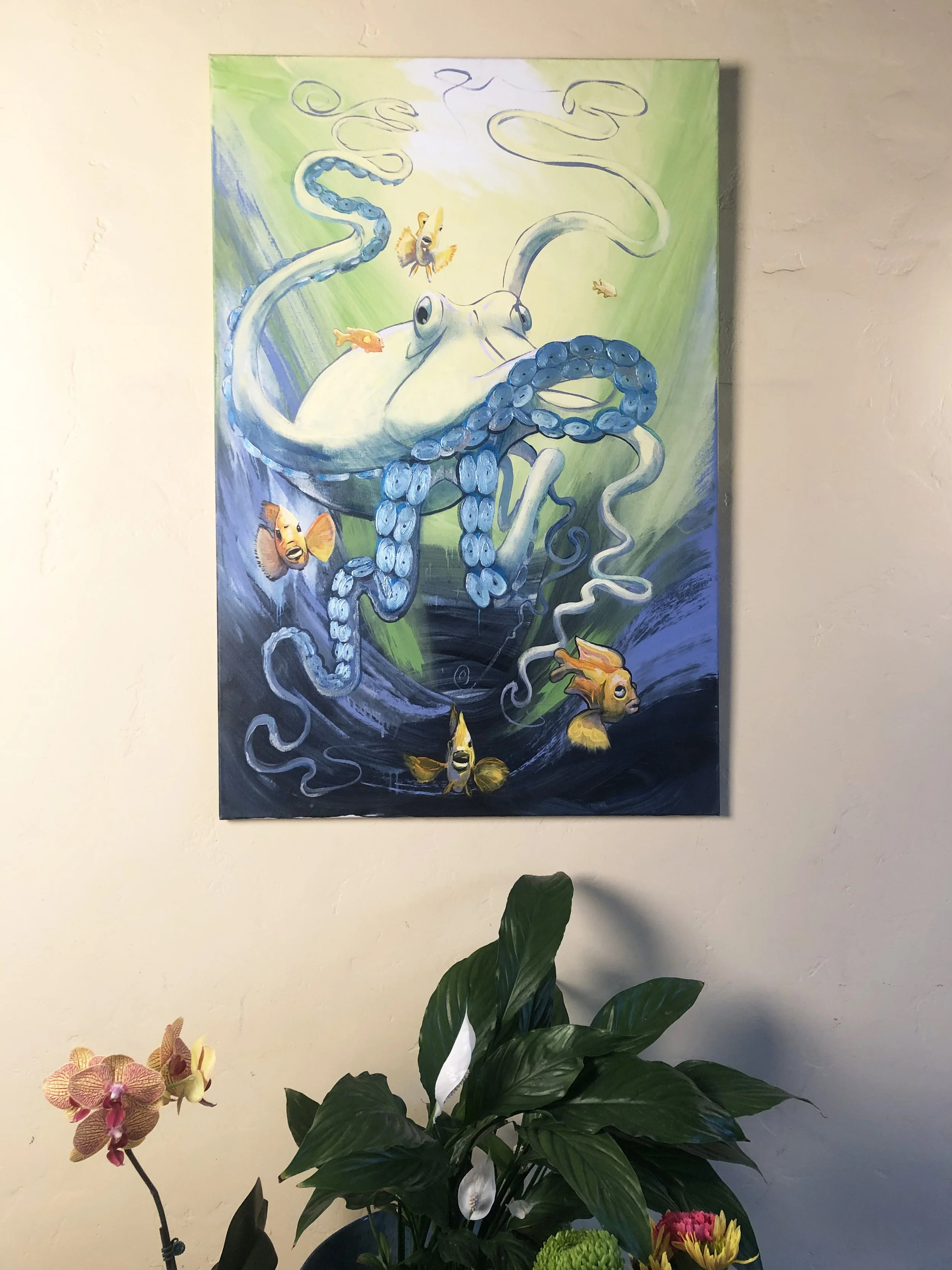 “These ocean paintings are a visceral response on my part, to point out that the oceans, and the creatures in it, are both alien to us, and at the same time our brothers and sisters, evolved from the same chain of evolution.  Go diving , and look in the eyes of a harbor seal, or feel the baby octopus clinging to you for protection; these are strikingly beautiful things with souls, communicating with us.”