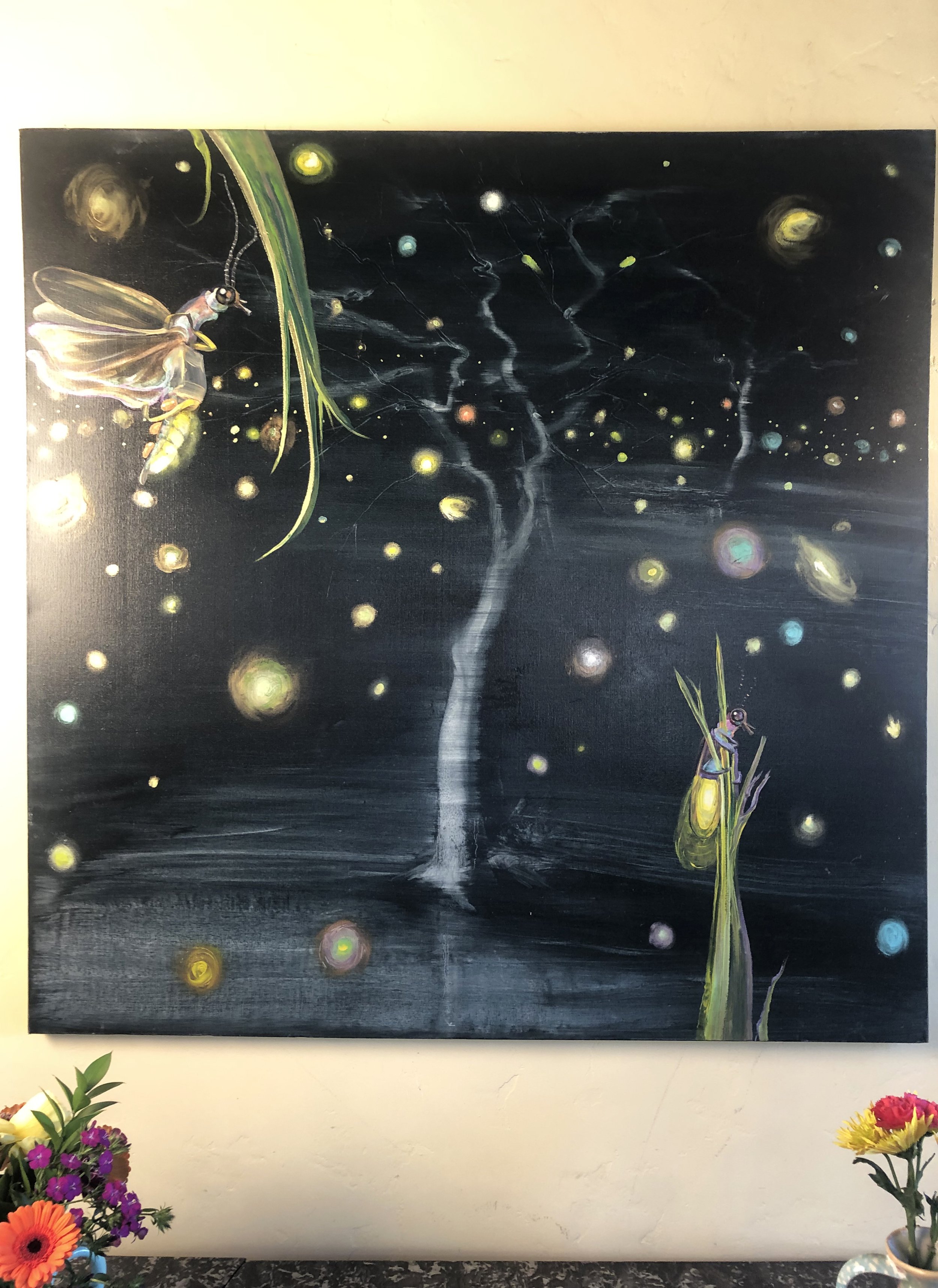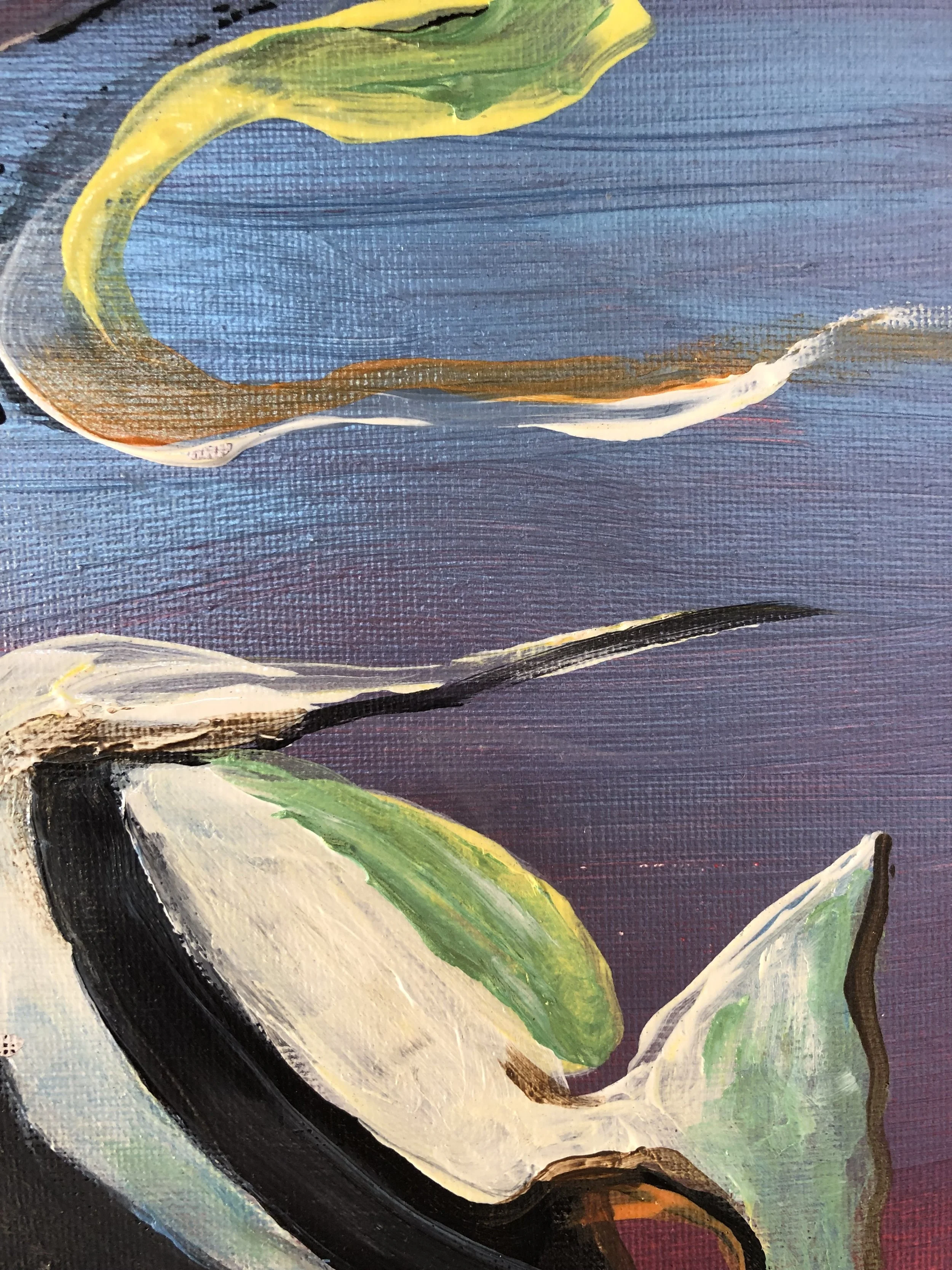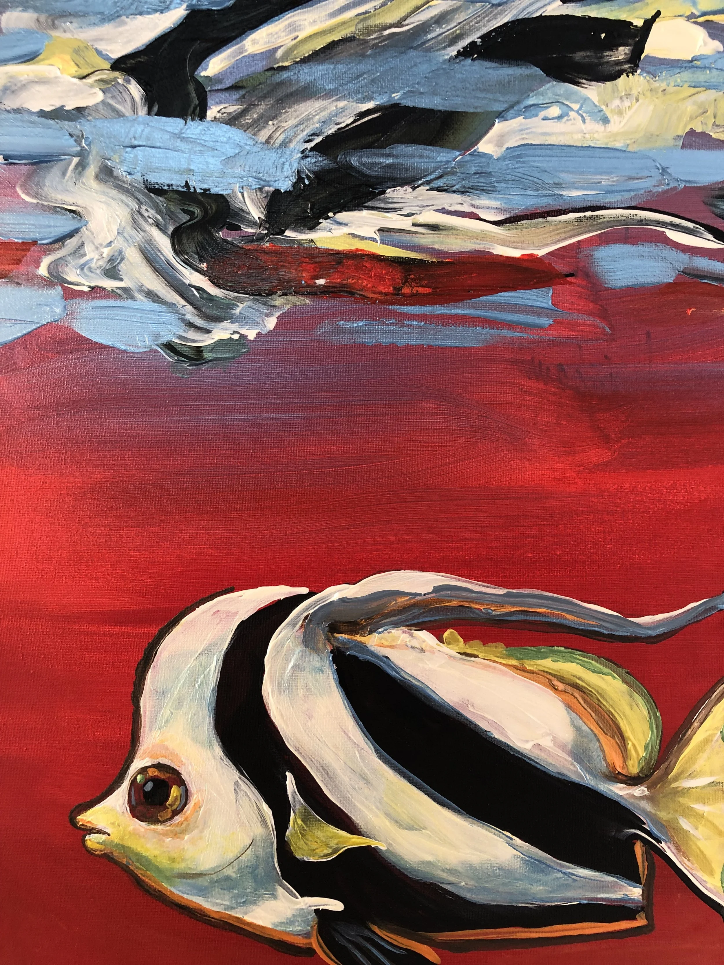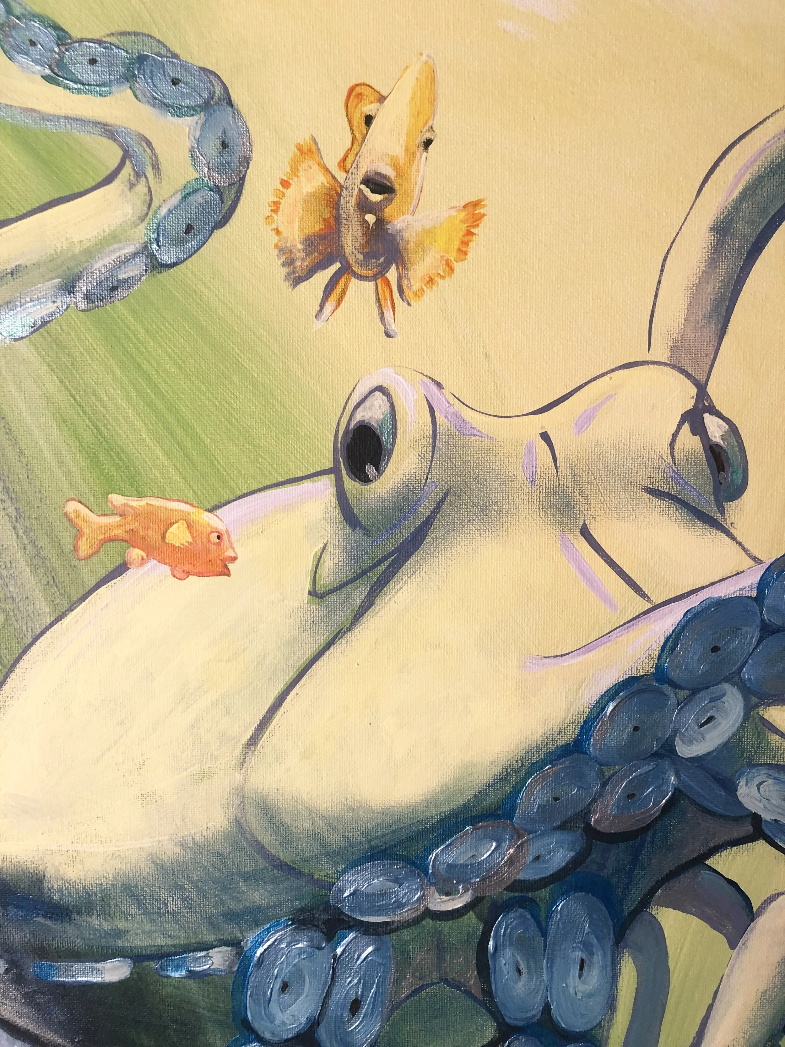 “These ocean paintings are a visceral response on my part, to point out that the oceans, and the creatures in it, are both alien to us, and at the same time our brothers and sisters, evolved from the same chain of evolution.  Go diving , and look in the eyes of a harbor seal, or feel the baby octopus clinging to you for protection; these are strikingly beautiful things with souls, communicating with us.”