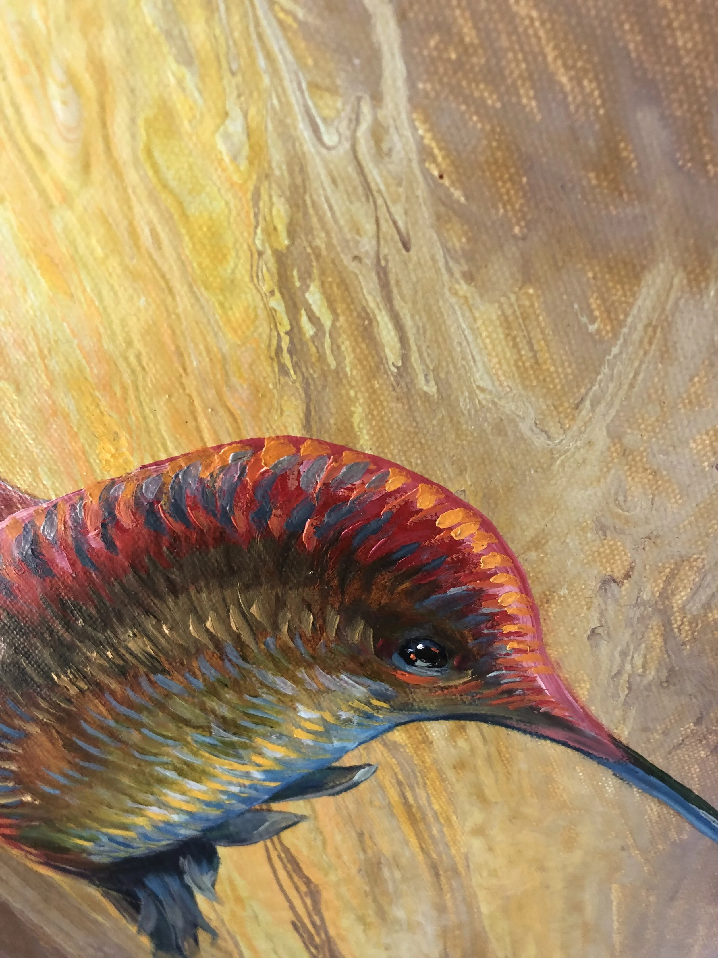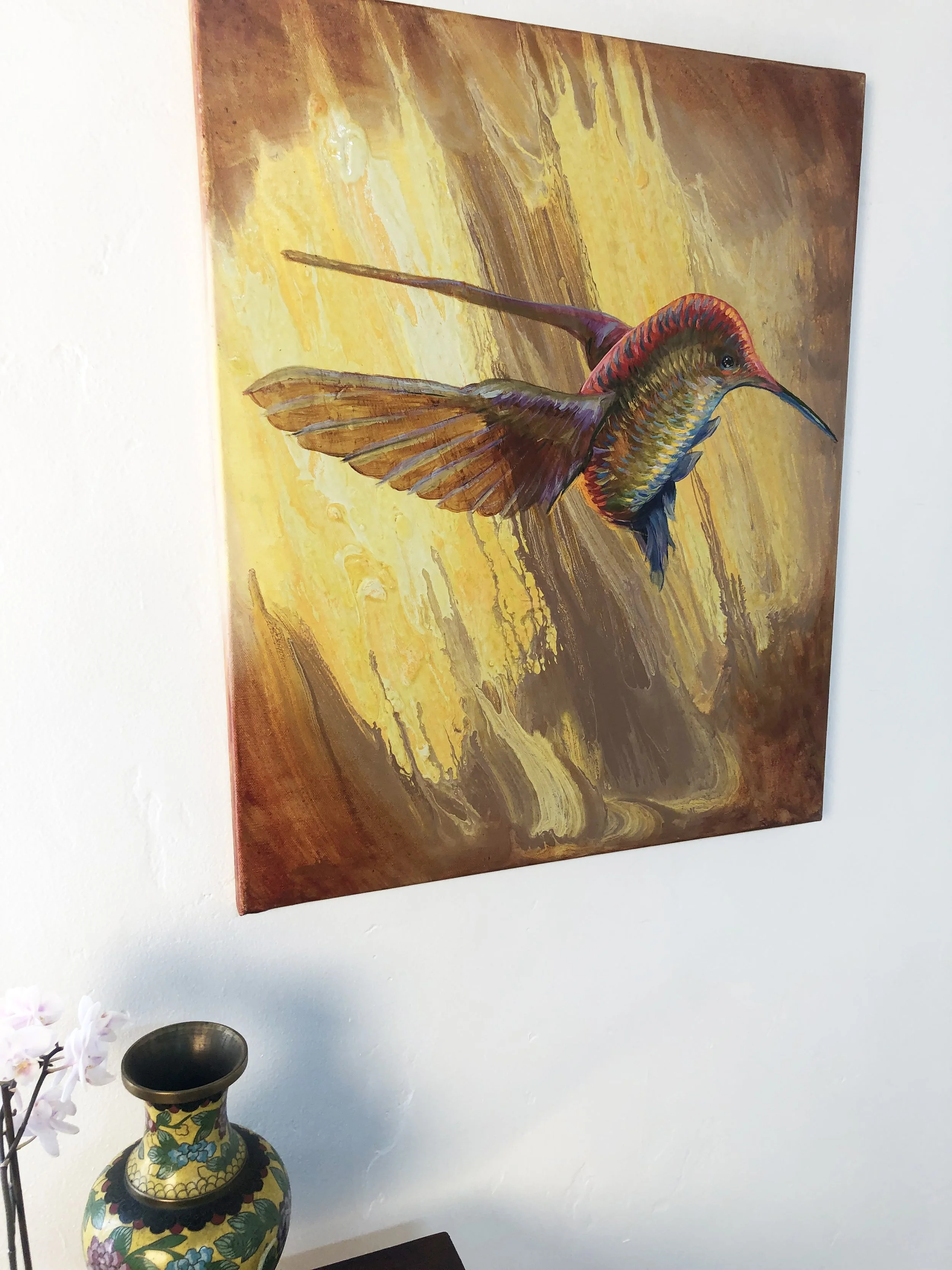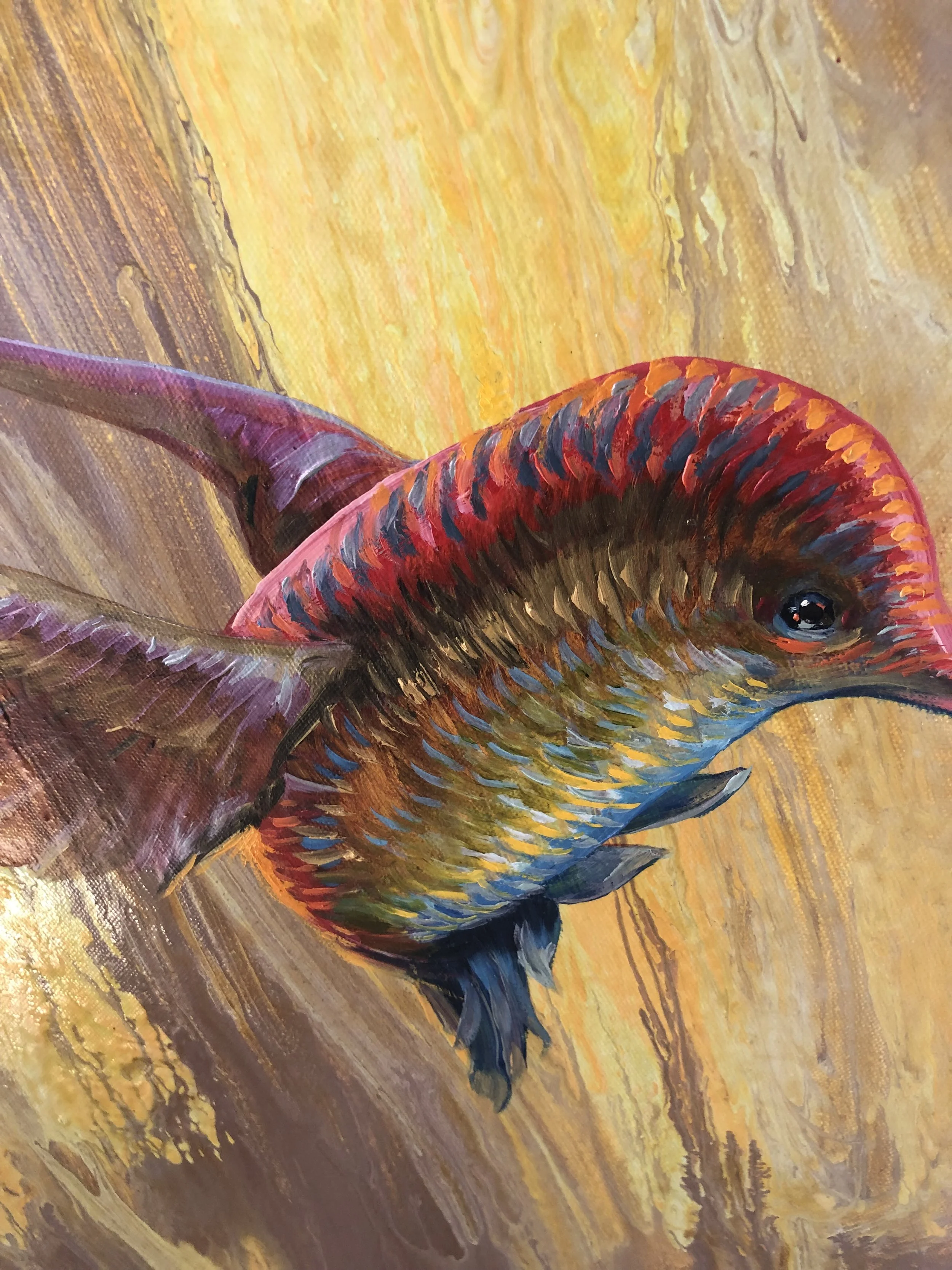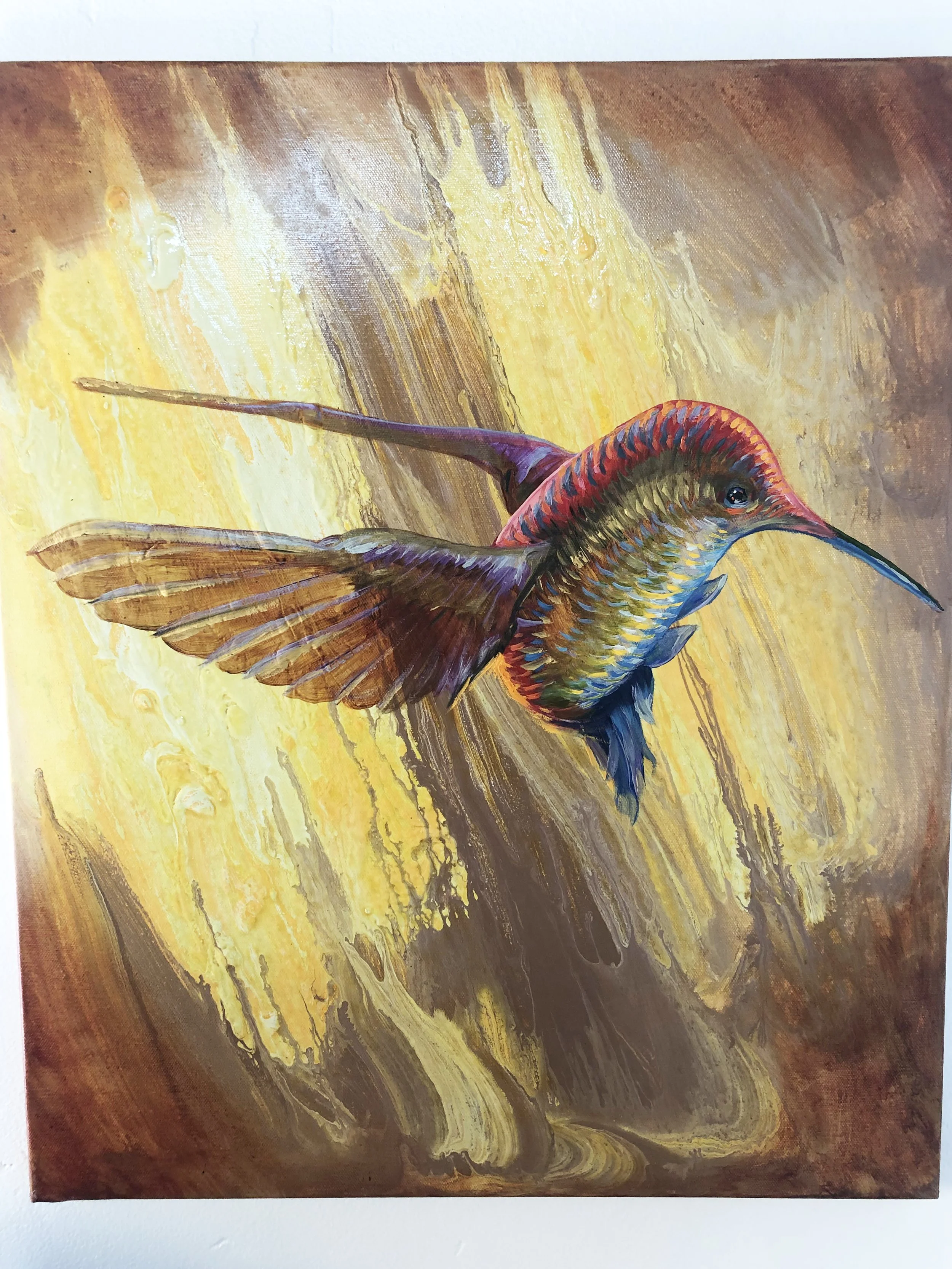 For "Rainbow Hummer" the picture started with a poured surface as a background. Turning the flow direction upright gave license to paint a hummingbird rising, as if pushed by the background winds.