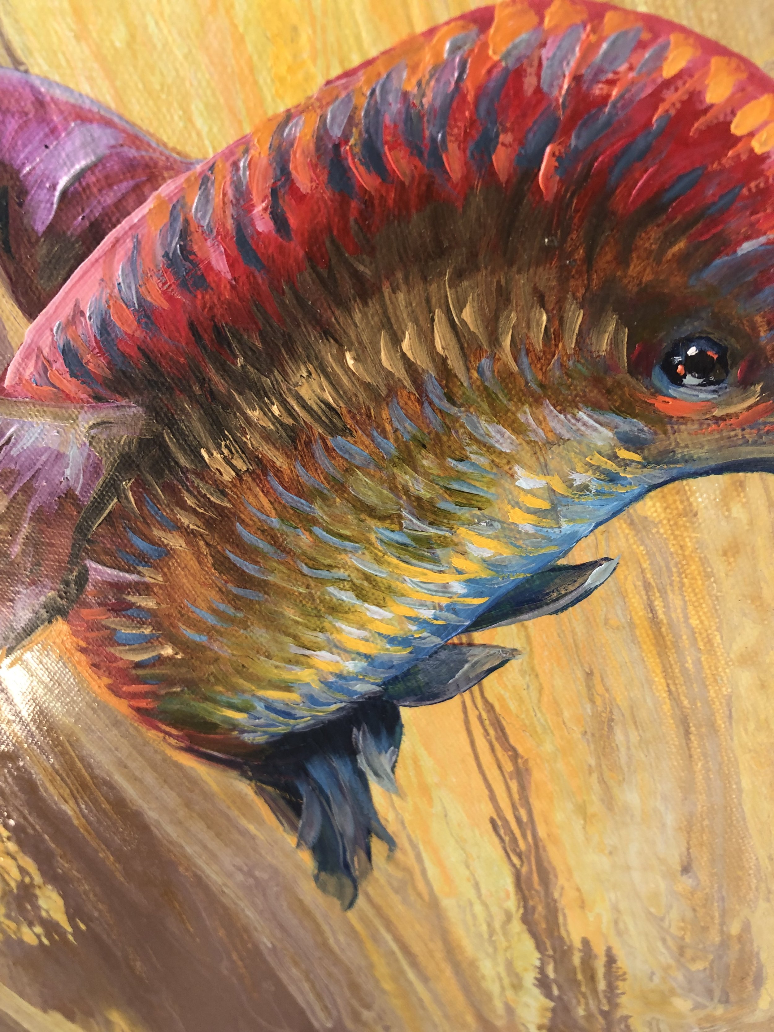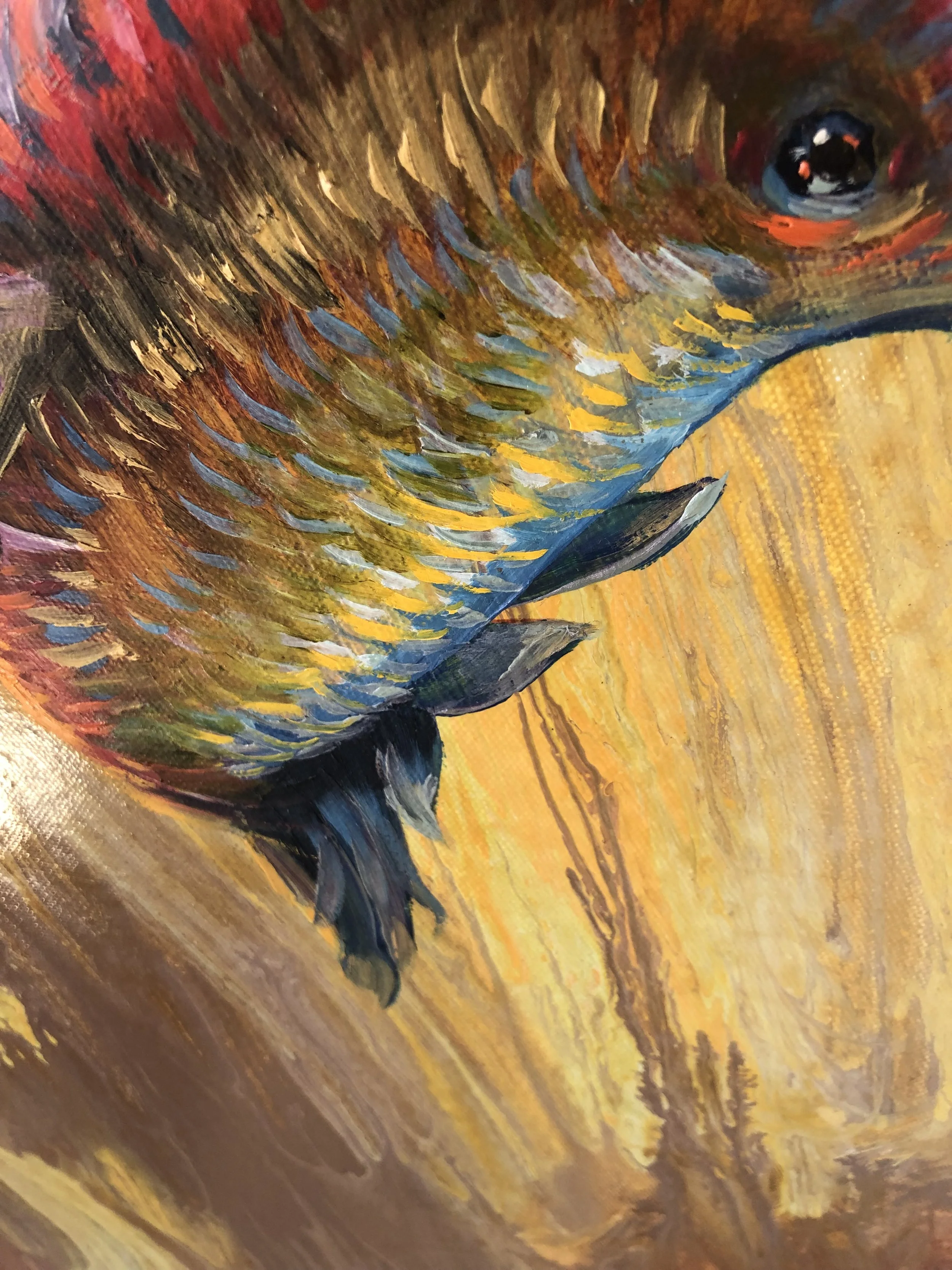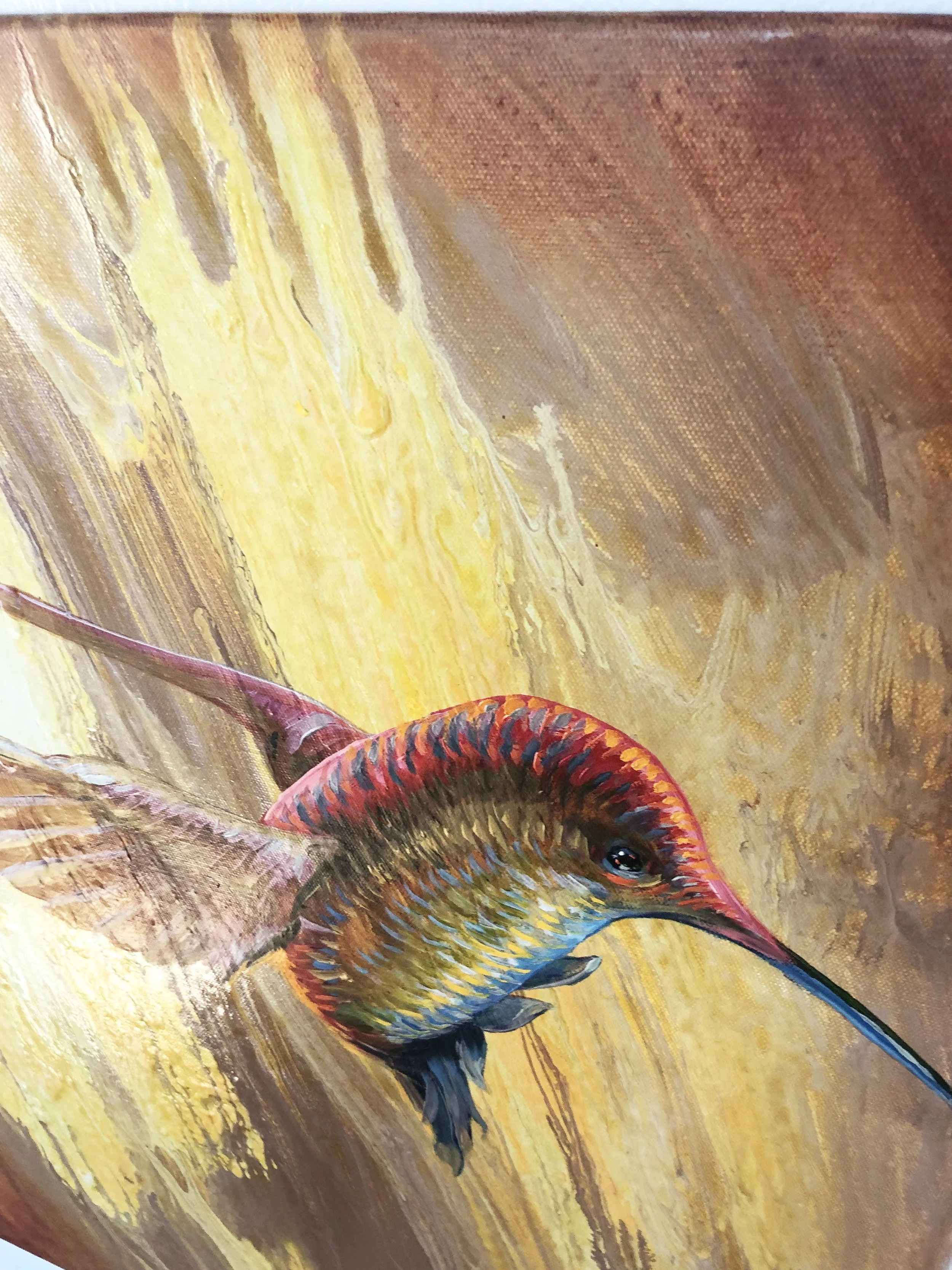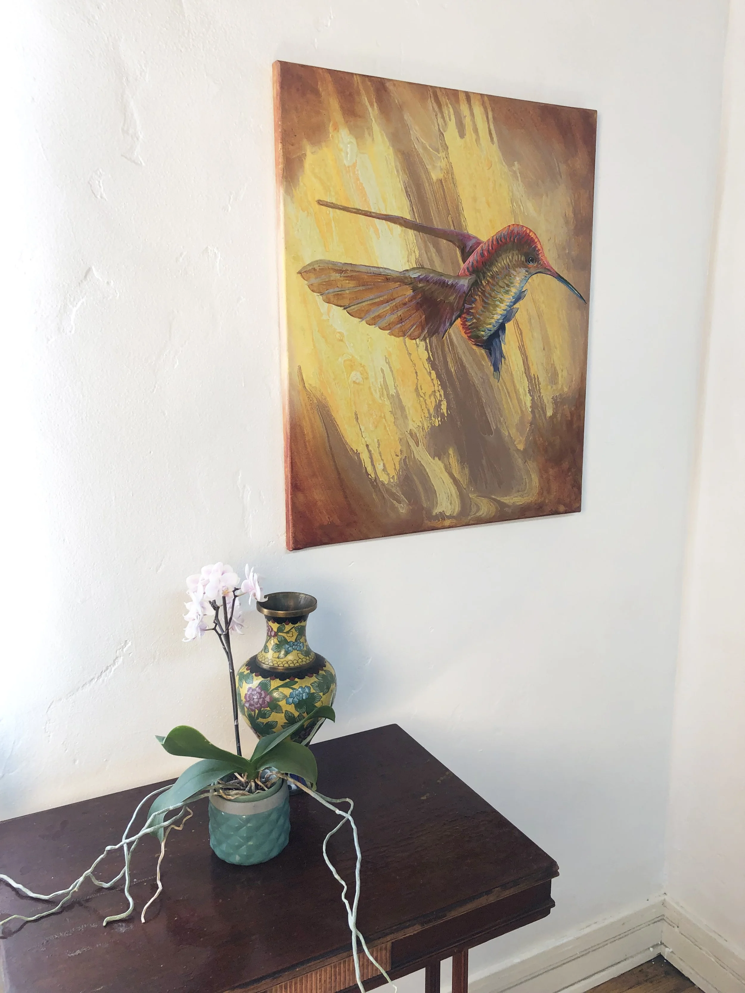 For "Rainbow Hummer" the picture started with a poured surface as a background. Turning the flow direction upright gave license to paint a hummingbird rising, as if pushed by the background winds.